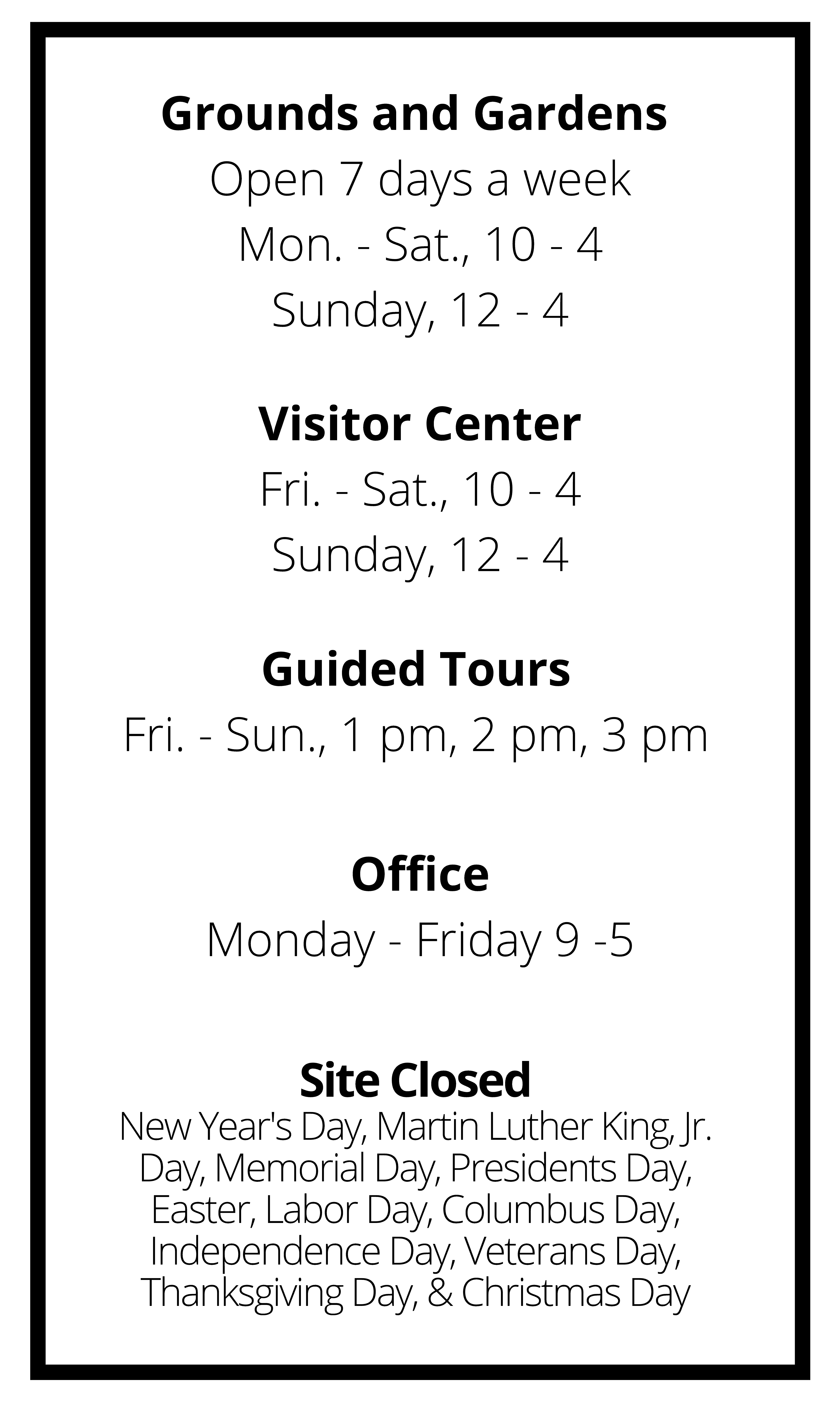 Guided Tour Season Over! As of November 1st, our Guided Tours, Visitor Center, and exhibit buildings are closed for the winter season. Visitors are still welcome to visit our grounds and take a self-guided tour of our outdoor signage throughout Fall and Winter. Although our Visitor Center is closed, the restrooms on the back side of the building will still be available for visitor use.